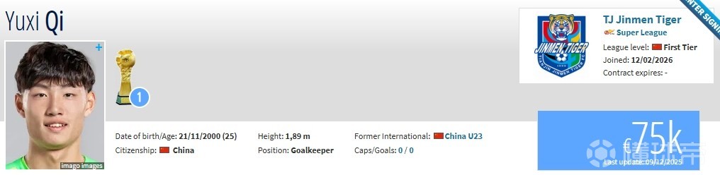 北京时间2月12日,德转更新,原南京城市门将齐雨熙加盟天津津门虎。